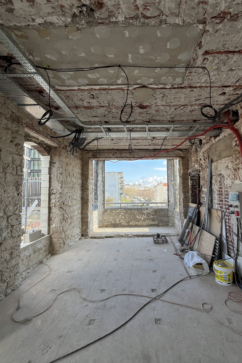 La Maison fait l'objet d'une restauration compléte en limitant les interventions contemporaines aux nécessités du programme et de l'usage. Une isolation par l'intérieur est réalisée en béton de chanvre recouvert d'un enduit terre afin d'améliorer les performances thermiques de l'ensemble.