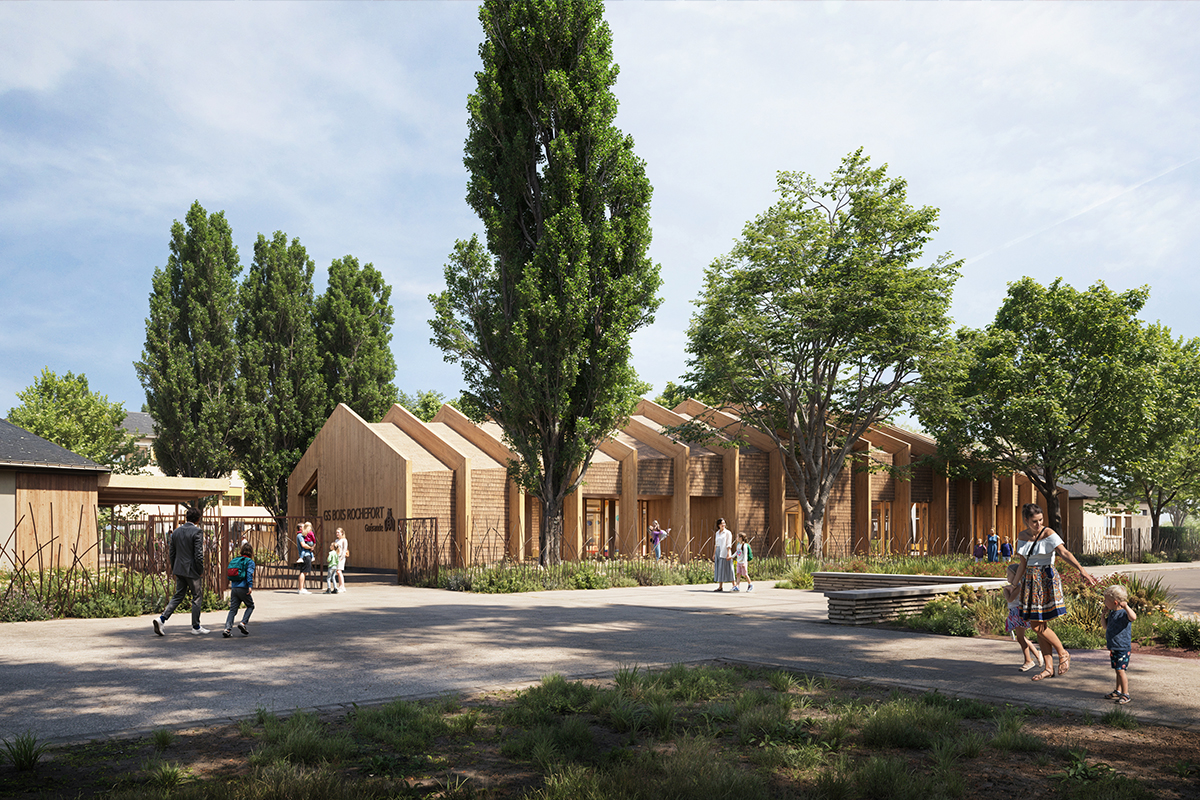 L'opération de réhabilitation-extension du groupe scolaire Bois Rochefort à Guérande vise à en faire le principal établissement du centre‑ville. Le projet comprend 14 classes (4 maternelles, 8 élémentaires, 2 « rotules »), des fonctions supports (administration, RASED, bibliothèque, ateliers), un centre de loisirs/périscolaire, ainsi qu'une restauration collective avec cuisine de production. Les espaces extérieurs (cours, préaux, prairie, jardins pédagogiques) sont requalifiés.
