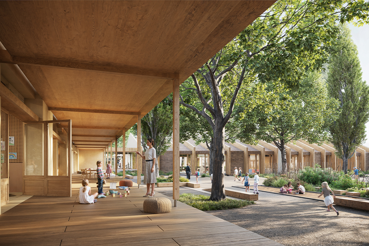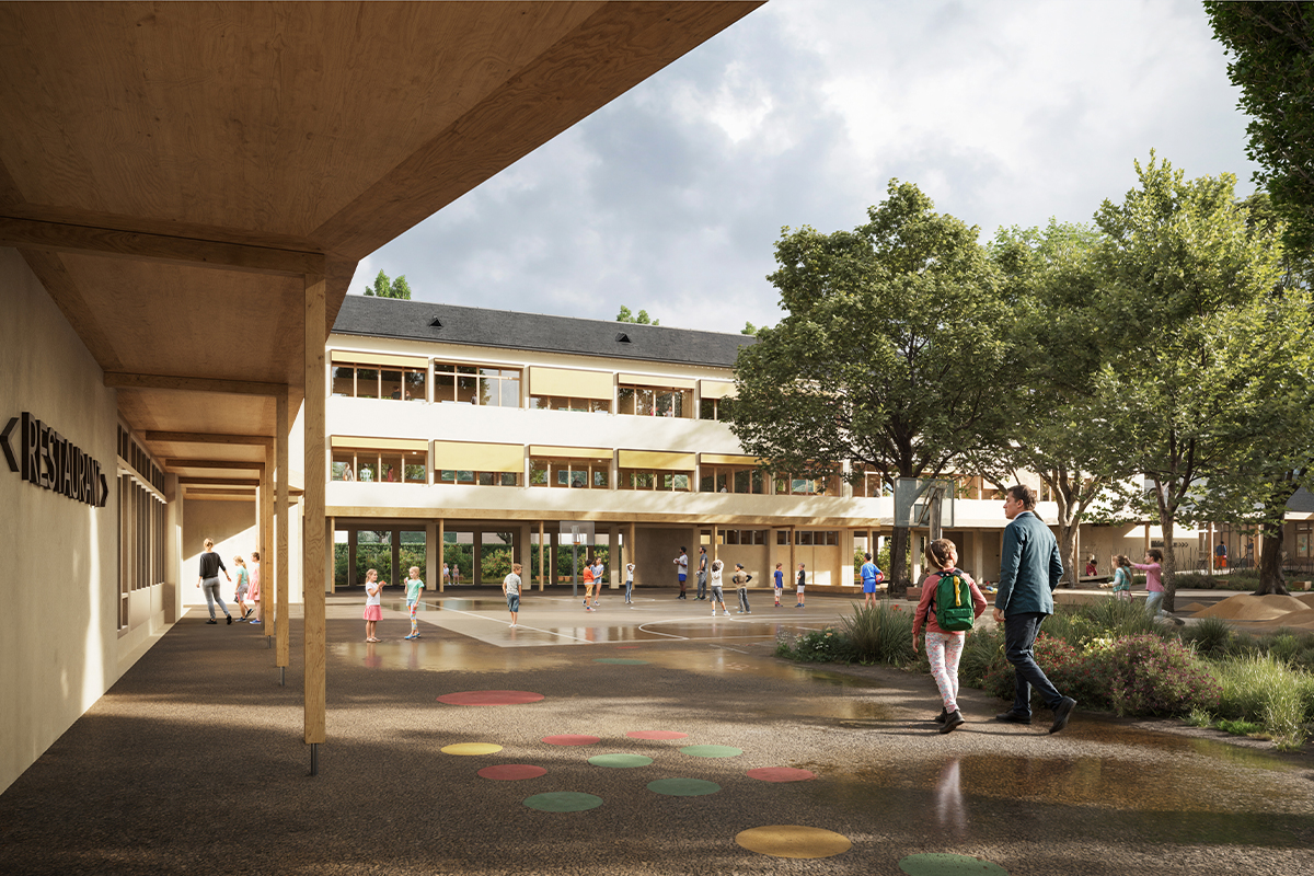 Le projet de réhabilitation et d'extension du groupe scolaire Bois Rochefort à Guérande transforme le site en conciliant requalification des espaces, adaptation pédagogique et enjeux climatiques. Au coeur du projet, le nouvel équipement organique et ludique, la « ruche », accueille le périscolaire et la salle de motricité, crée un parvis commun et structure trois accès pour maternelle, élémentaire et périscolaire. Cette « folie » architecturale affirme l'identité du lieu tout en s'insérant dans le tissu existant : volumes, toitures et proportions sont préservés, complétés par des interventions ponctuelles (préaux, brise-soleil, terrasses).