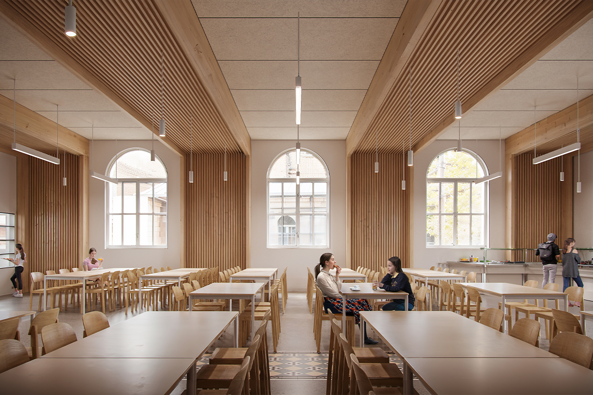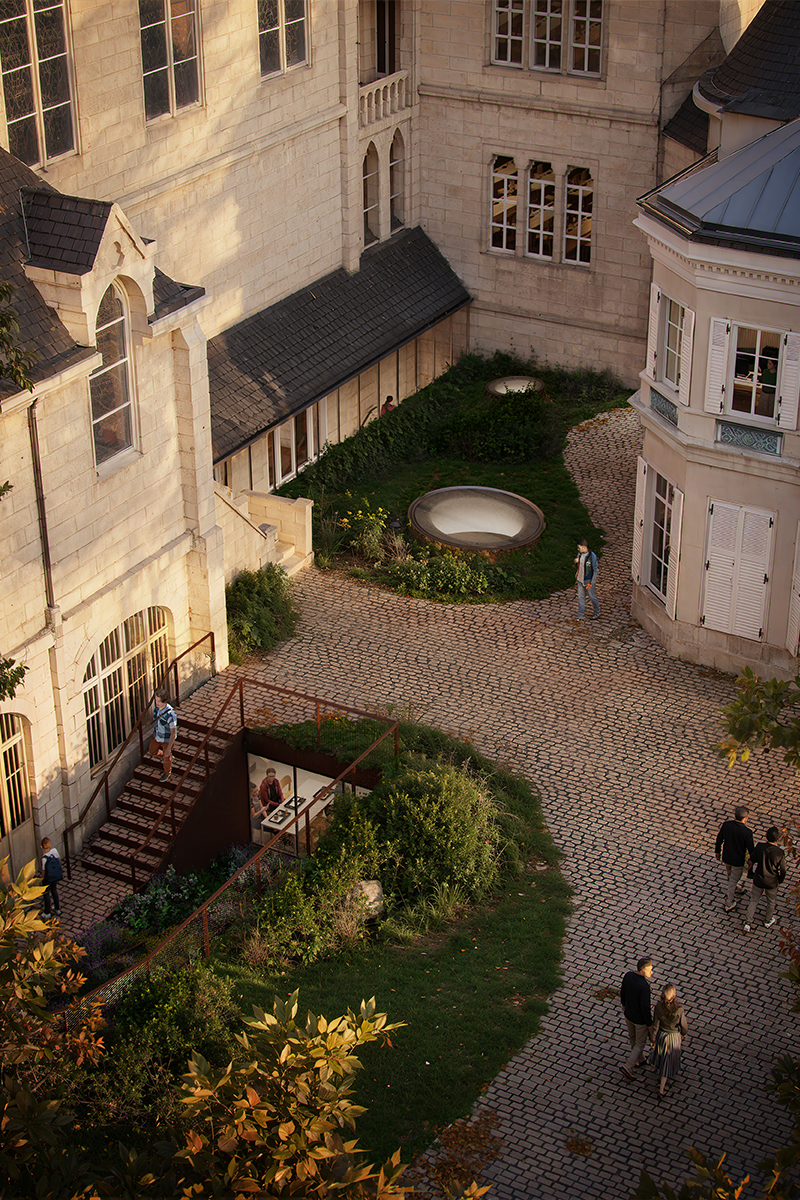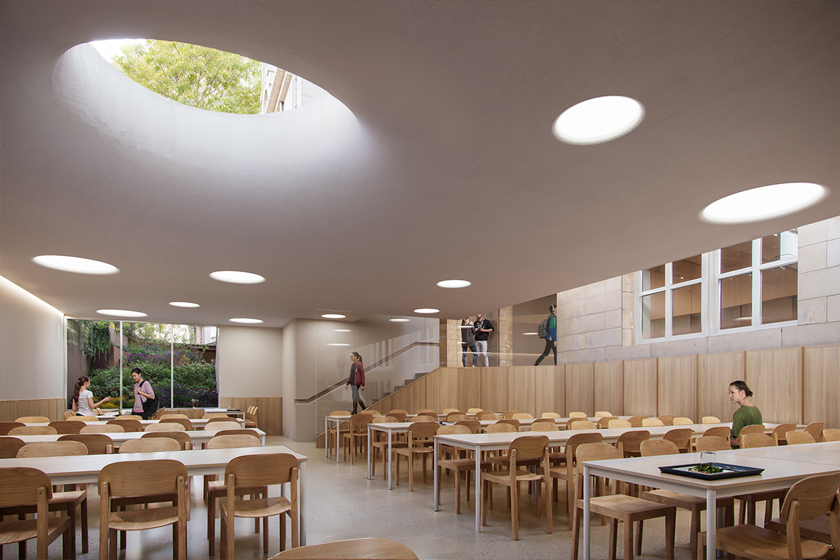 Le réfectoire des lycéens s'étend en sous-sol entre la Chapelle et le Pavillon Wurtemberg, entièrement guidé par la lumière : deux larges puits circulaires zénithaux, un bandeau vitré sous la coursive et une large baie ouverte sur un jardin en creux baignent les convives d'une lumière naturelle structurante. La coursive, couverte d'ardoises en écho à la Chapelle, recompose l'accès des lycéens depuis le Pavillon Wurtemberg.