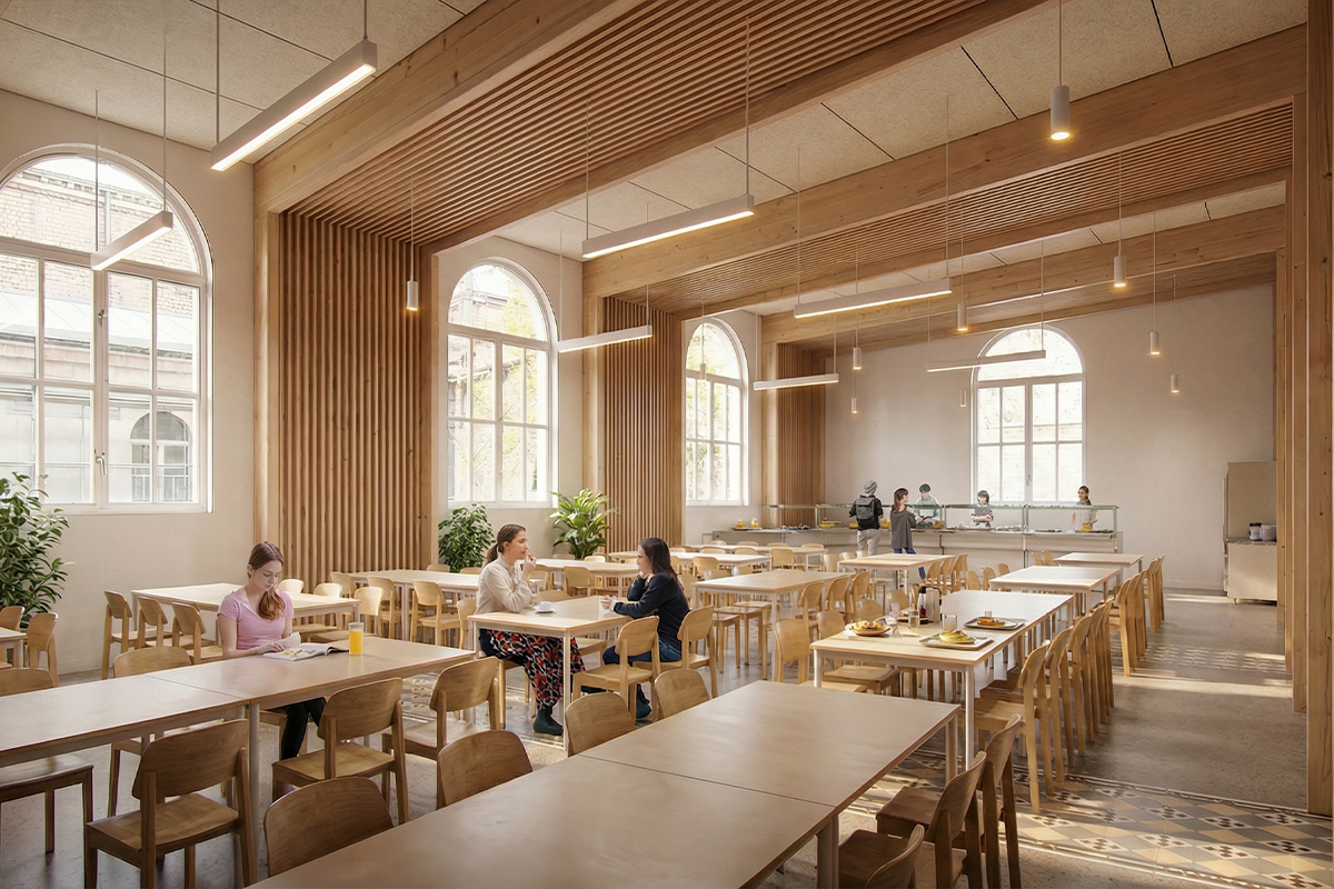 Les flux sont entièrement repensés et clairement différenciés selon les niveaux - maternelles, primaires, collégiens, lycéens et professeurs - pour fluidifier les circulations et améliorer l'acoustique des salles. La cuisine est agrandie, la laverie étendue, les vestiaires du personnel relocalisés. La toiture du nouveau réfectoire est aménagée en terrasse plantée, prolongeant le cadre paysager généreux de l'Institution.