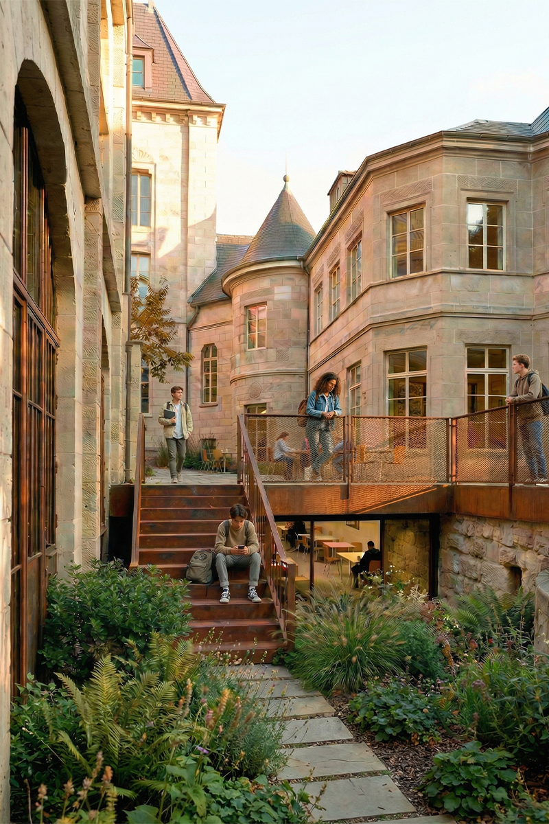 Le site de l'Institution Saint Dominique est exceptionnel, associant architecture patrimoniale - Grand Maison, Chapelle et Pavillon Wurtemberg - et espaces généreusement végétalisés. L'intervention contemporaine s'inscrit avec discrétion dans les interstices de ce cadre remarquable, en préservant les espaces extérieurs et le rapport harmonieux entre bâtiments et végétal.