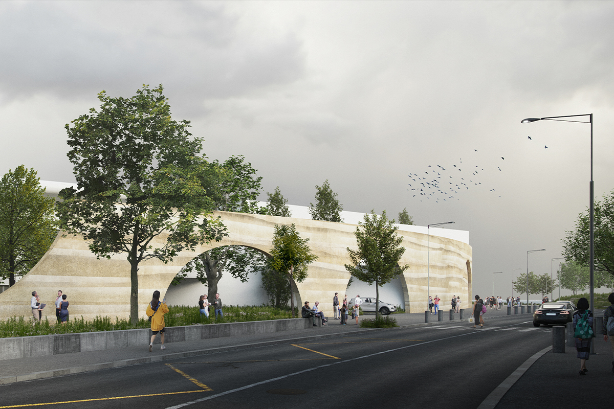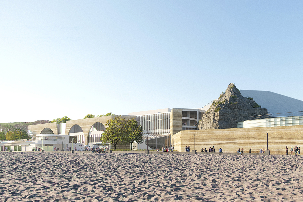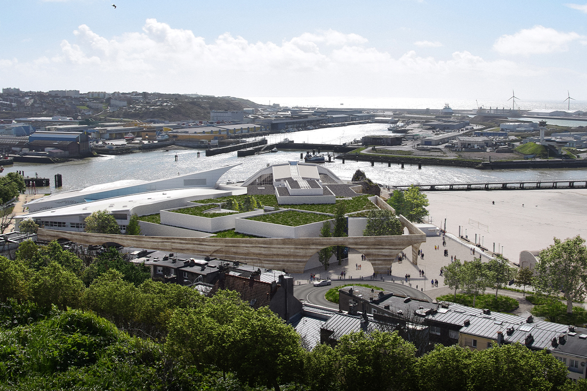 Notre projet pour le Grand Nausicaá achève le cycle des extensions par une façade unificatrice en béton damé de réemploi, inspirée des falaises de la Côte d'Opale et largement ouverte vers la mer pour révéler la vie intérieure du Centre National de la Mer. Cette nouvelle enveloppe, percée d'arches monumentales, accueille le public, structure un parvis actif face à la Manche et ménage des jardins en gradins au-dessus du front urbain de l'avenue Saint-Beuve.