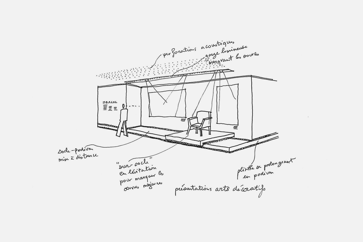 Le projet affirme son identité et sa spécificité autour d'un grand vide latéral le long d'un mur rouge toute hauteur, qui amène la lumière au coeur des expositions ; celles-ci sont traitées dans une échelle plus domestique, celle des oeuvres et des mobiliers présentés.