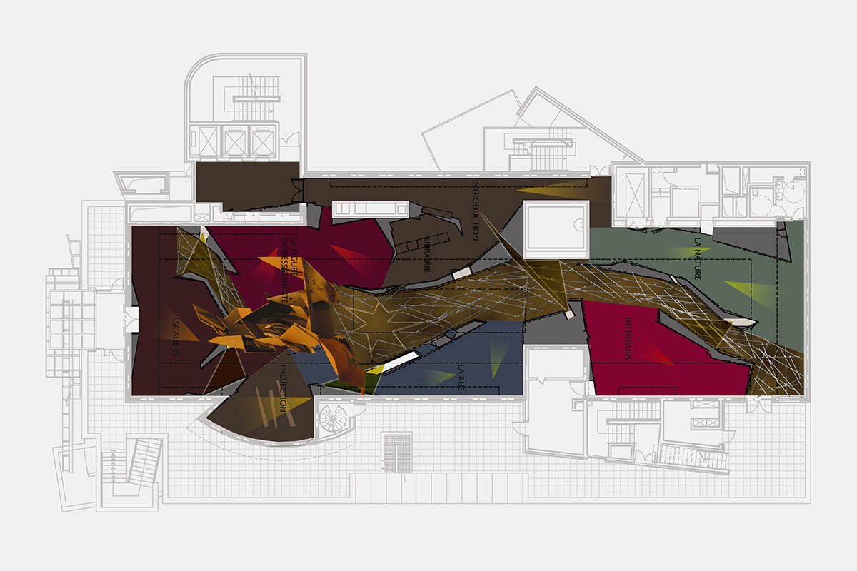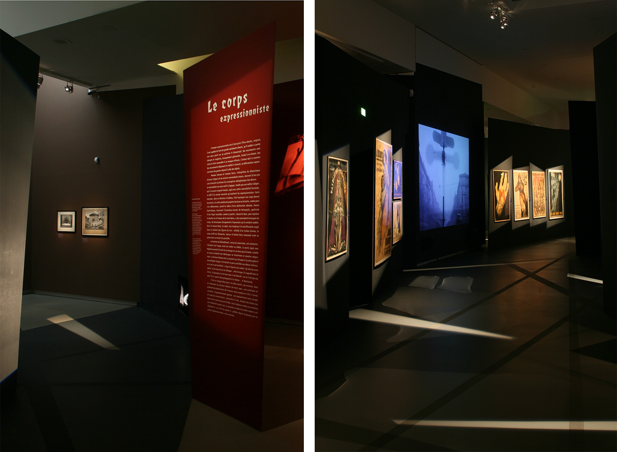 Le mouvement expressionniste affirmait un art paroxystique et révolté, des formes dures, agressives, volontiers caricaturales. La scénographie va donc plonger le visiteur dans cet univers, le déstabiliser,.... Elle innerve la salle, et initie une scénographie au «cutter», contemporaine, déstructurant l'espace «académique» du lieu.