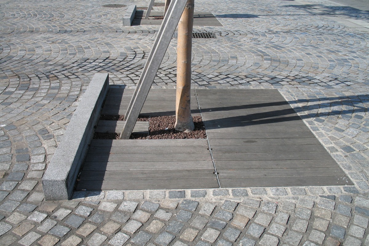 Les matériaux utilisés, pavés ou dallages de pierres naturelles, marquent les différents espaces tout en unifiant l'ensemble de l'aménagement. Seul le parking, pour des raisons d'usages, est traité en enrobé.