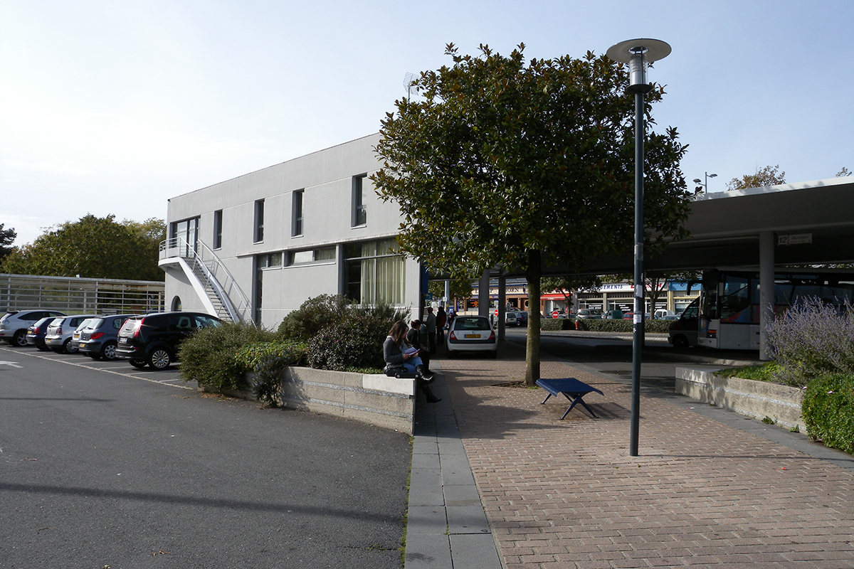 Programme : Traitement des sols, parkings, plantation, mobilier urbain, éclairage, rond-point. Création de la gare routière et Réfection de l'auvent extérieur en béton de la gare (hall et services, bureaux, salle d'exposition) (abords gare)