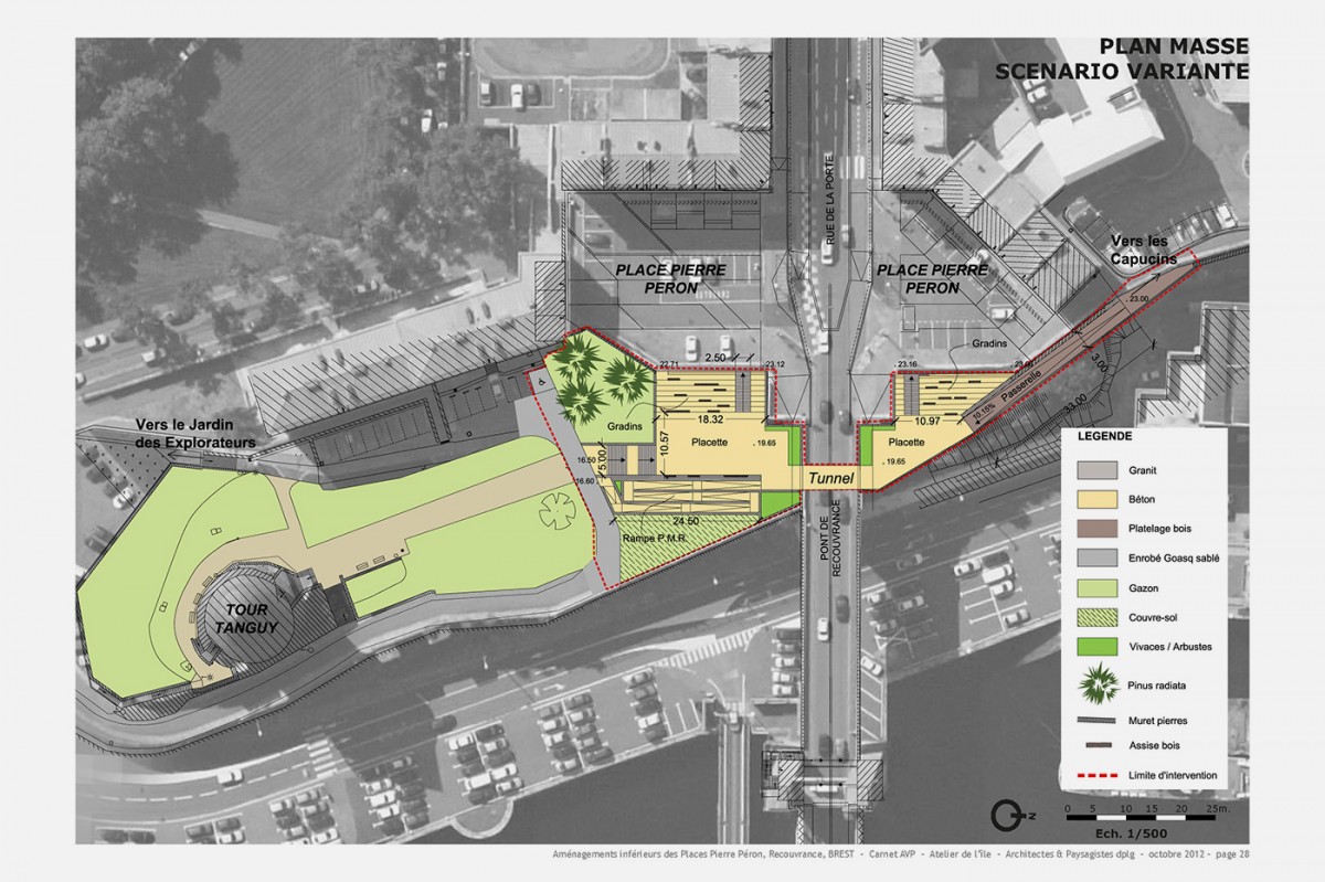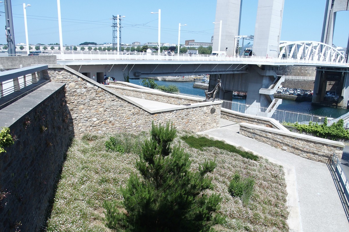 passerelle : calquée sur le modèle des passerelles du Pont de Recouvrance, elle établit la connexion des placettes vers le Plateau des Capucins, et permet d'ouvrir visuellement et physiquement la placette Nord.