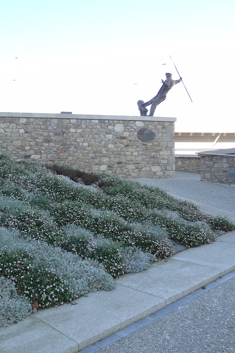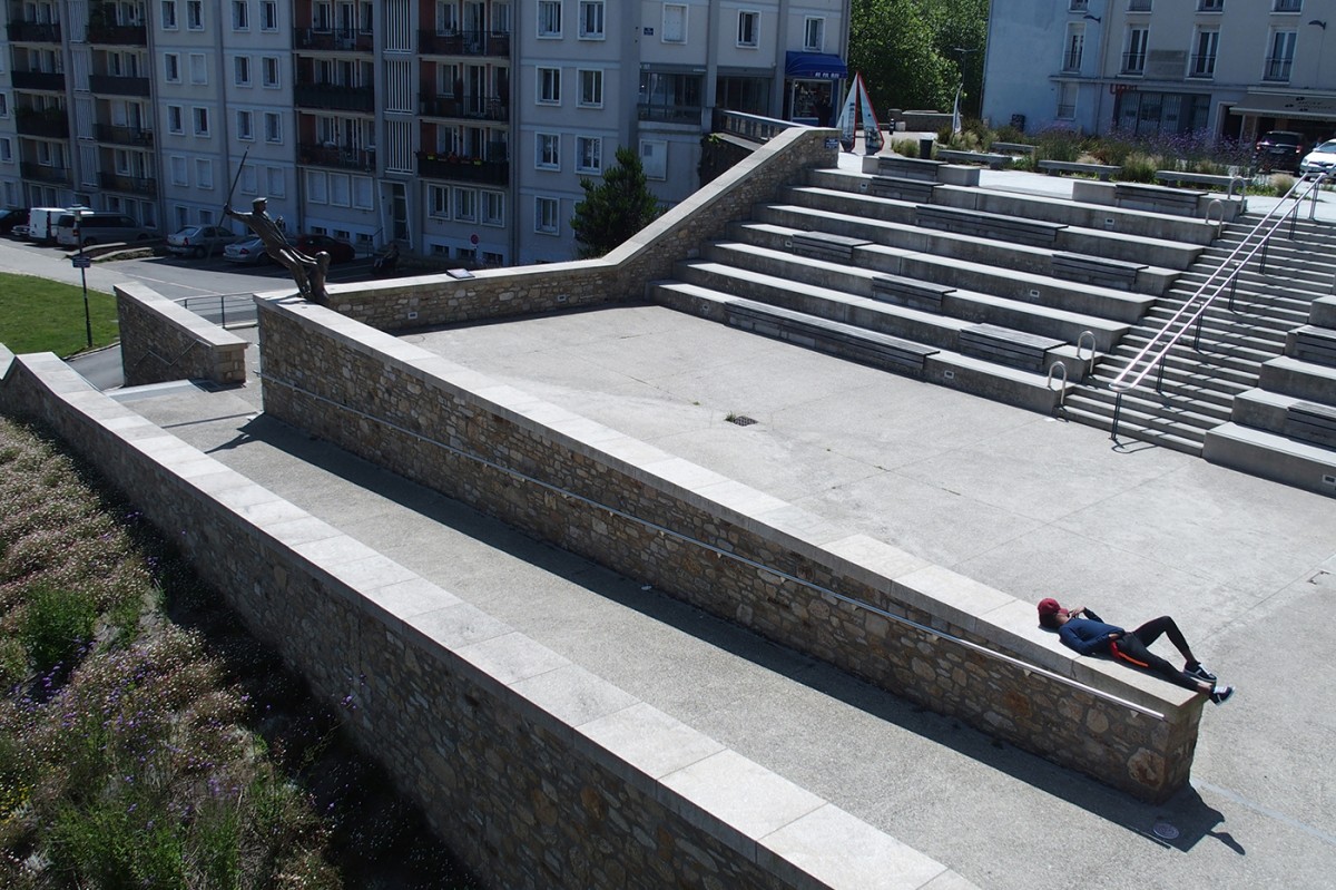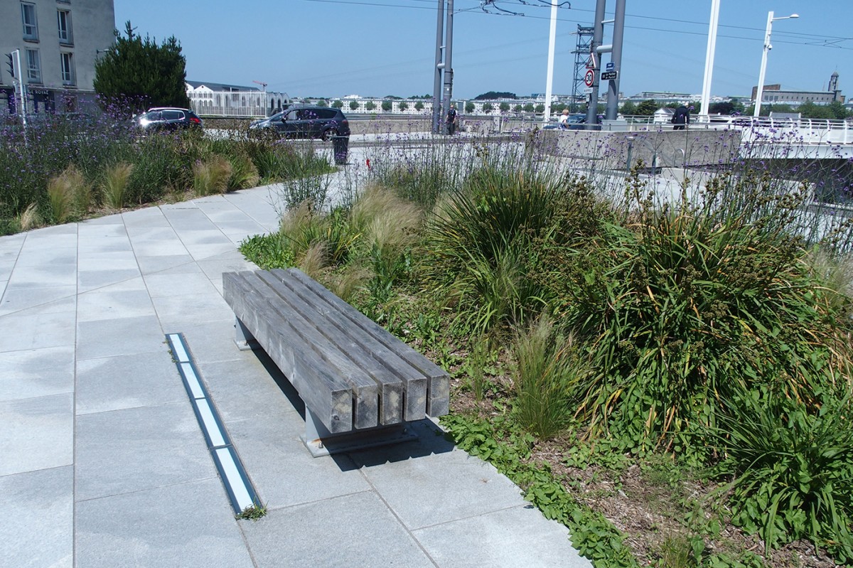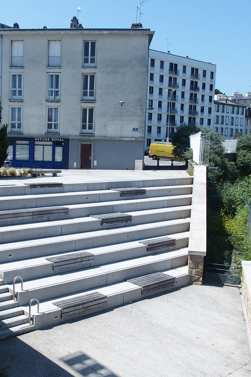 gradins : espaces de repos et de contemplation, ils permettent l'accès aux placettes inférieures par des emmarchements en granit, pouvant être investis pour des manifestations festives.