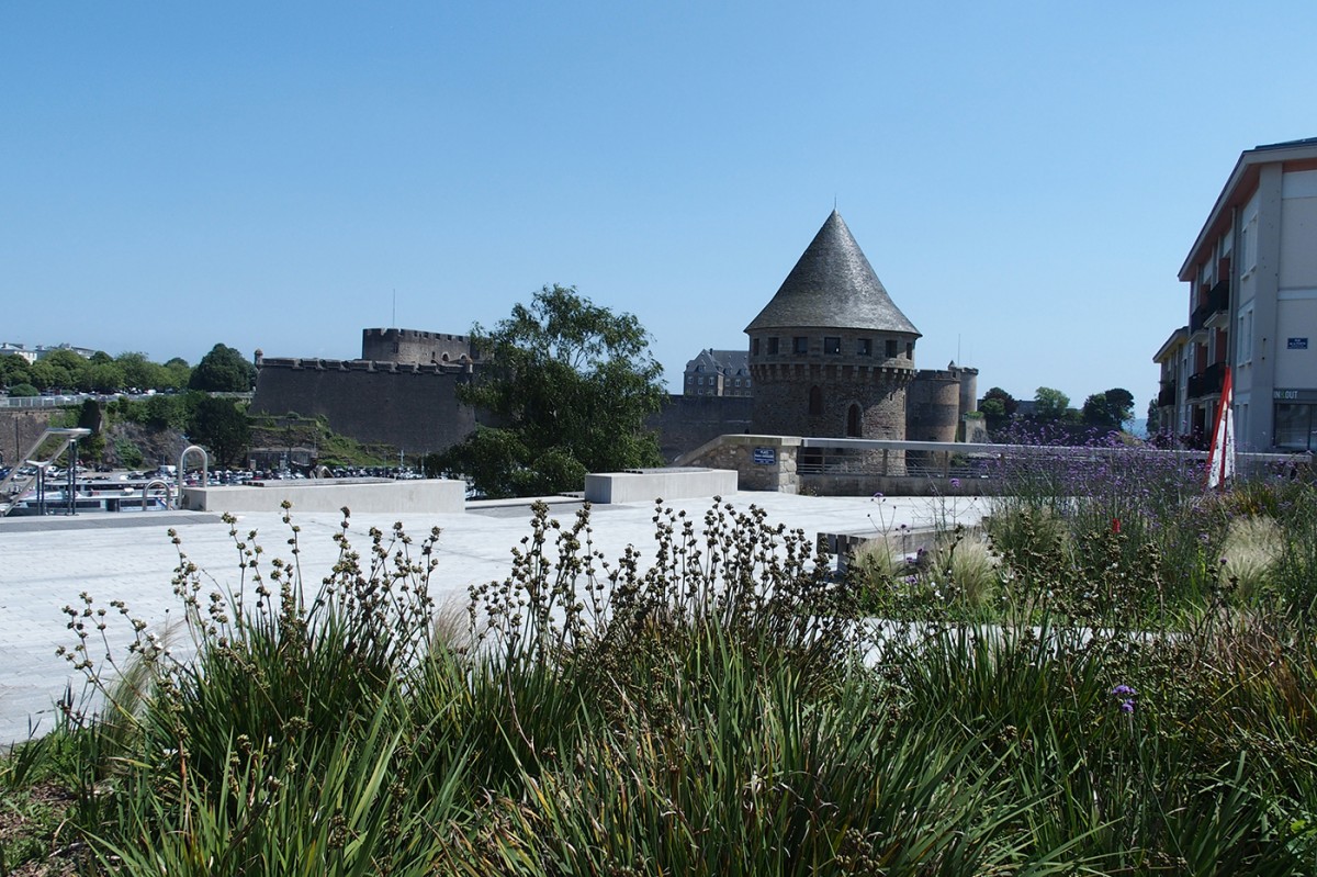 emmarchements mixtes piétons/vélos, poussettes : mixant accessibilité et intégration dans le site, ils permettent de gérer un fort dénivelé tout en permettant le lien placettes/Tour Tanguy,