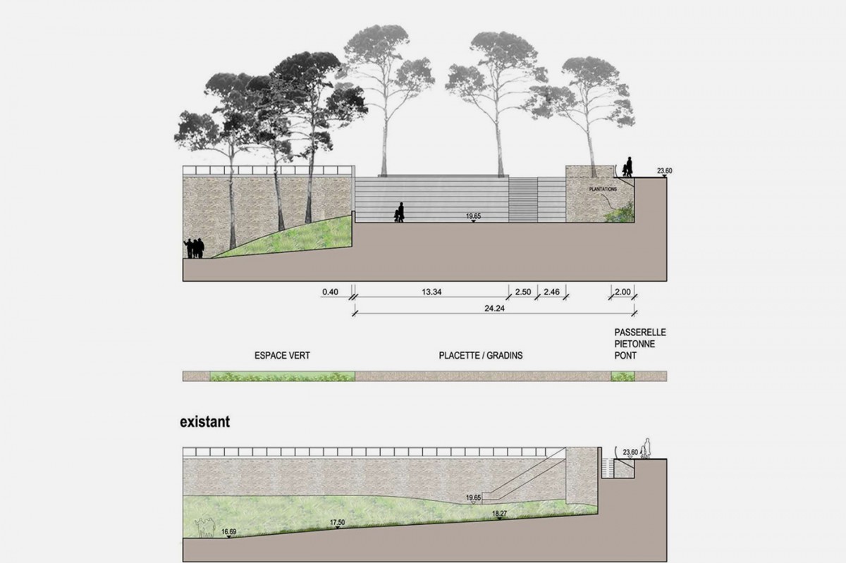 placettes : plateaux inférieurs reliés par le tunnel, elles font écho aux places, dans des dimensions plus intimistes, à la fois espaces de connectivité, de repos, de rencontre, dans un cadre à l'abri des bruits urbains et propices à la contemplation,