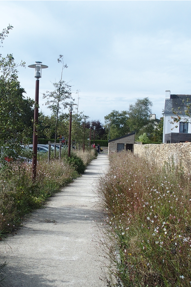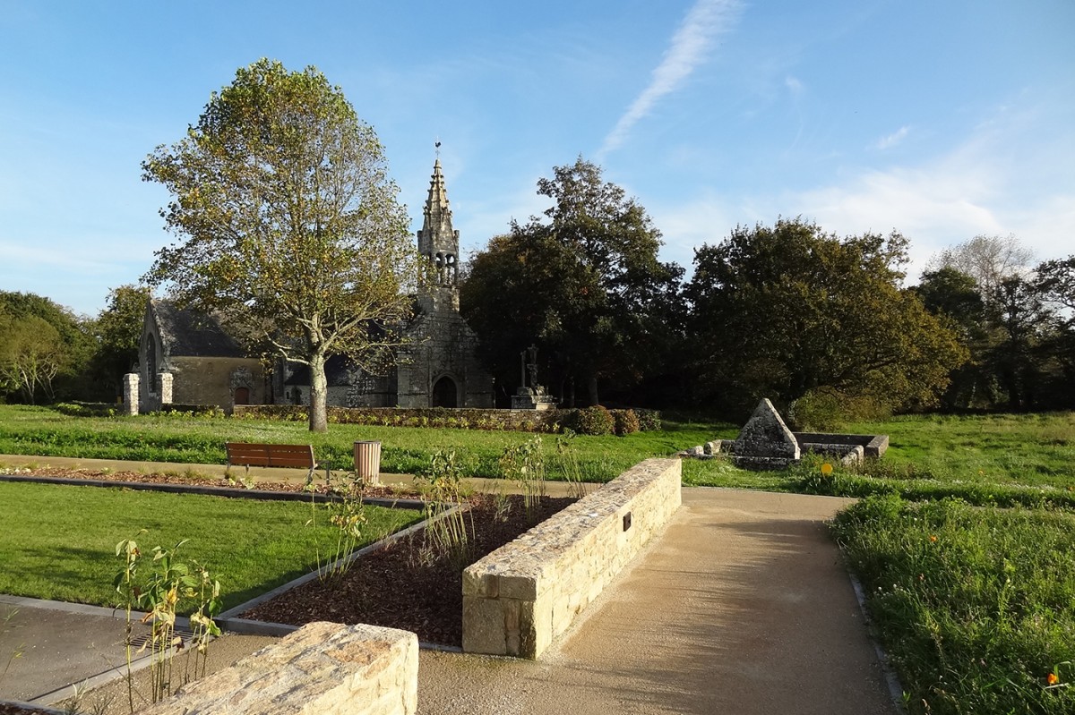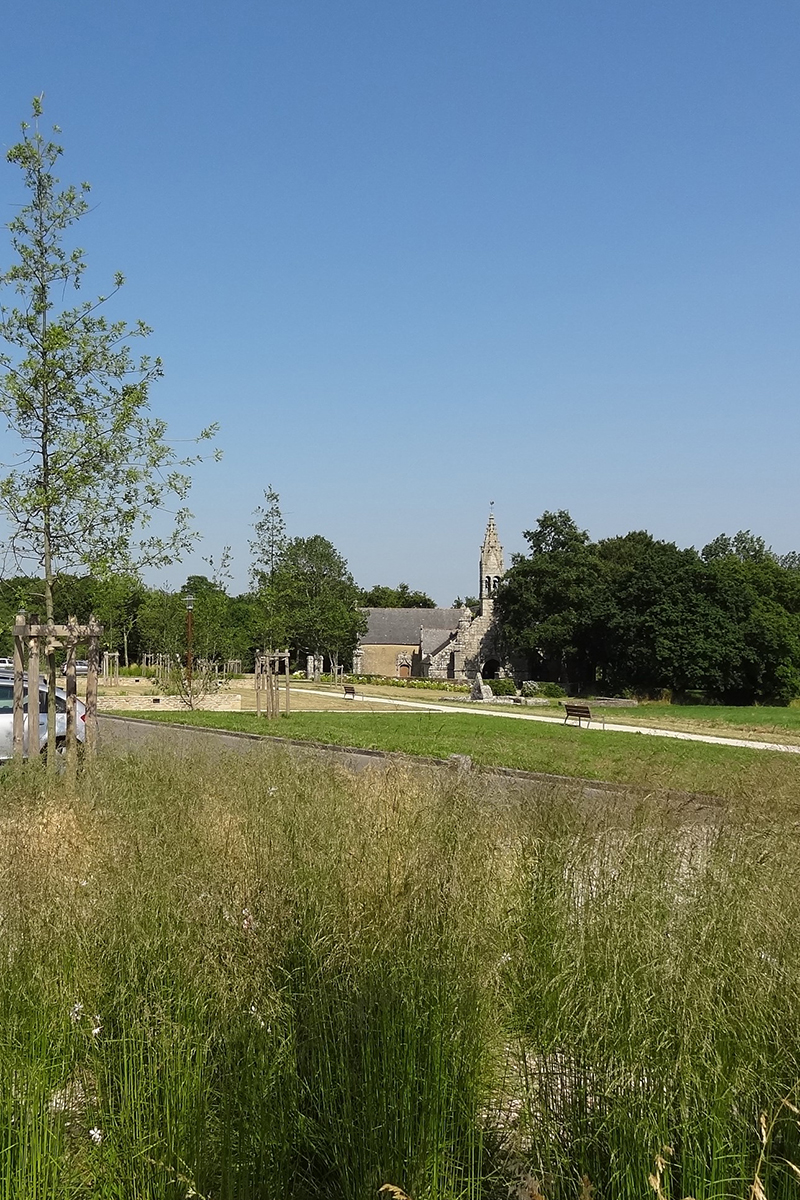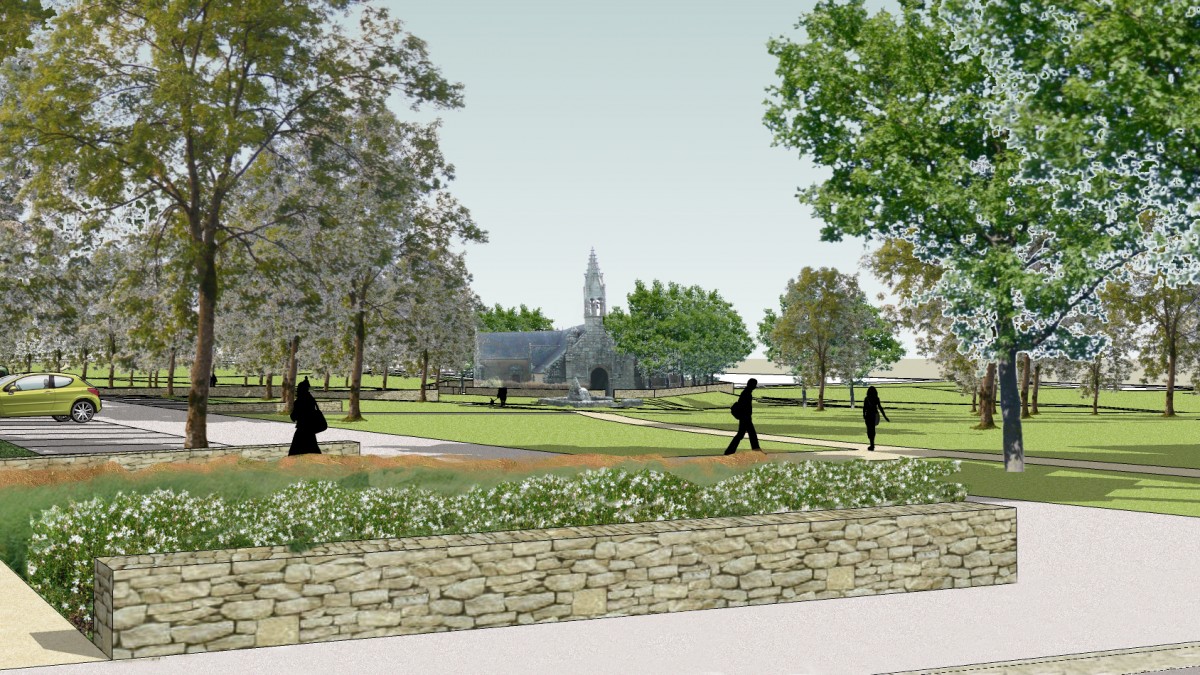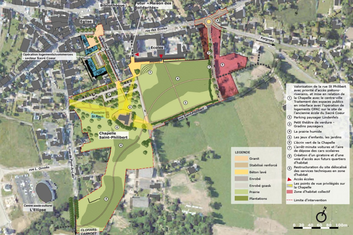 Le projet d'aménagement vise la mise en valeur du site patrimonial de la Chapelle Saint Philibert, située à proximité immédiate du centre bourg de Moëlan-sur-mer. Il se construit en corrélation avec la création de bâtiments, de voiries, de circulations douces à travers une prairie humide, et la restructuration du parking Lindenfels ; ce parking , planté d'arbres et de vivaces, établit une transition douce entre espaces urbanisés et espaces naturels.