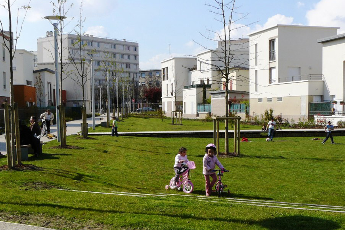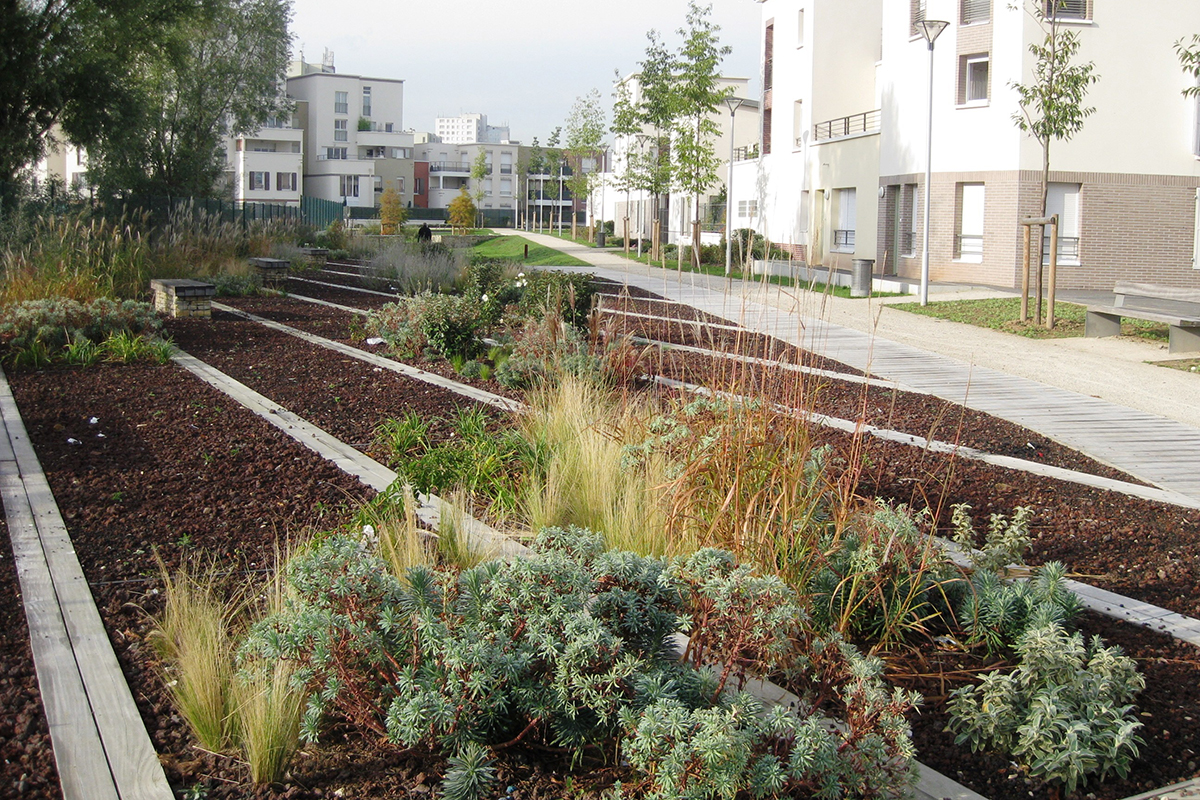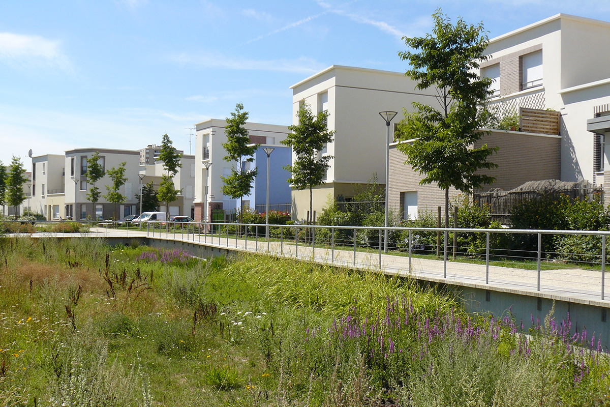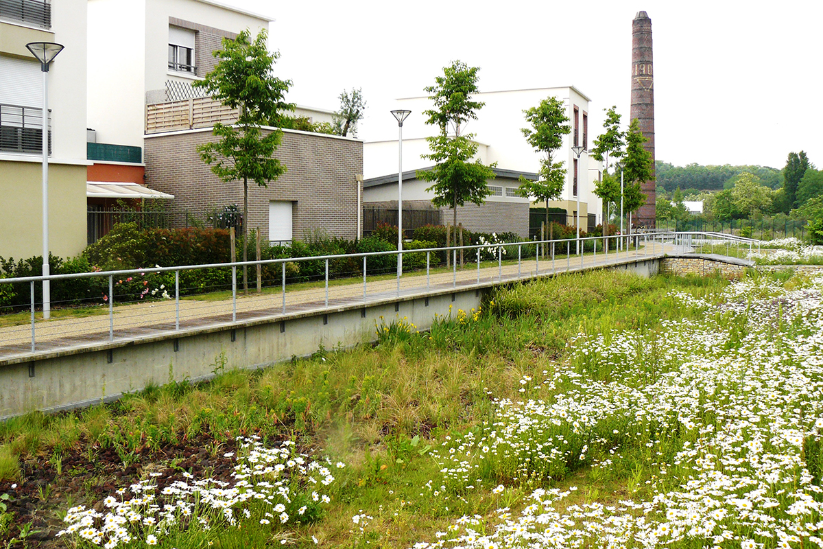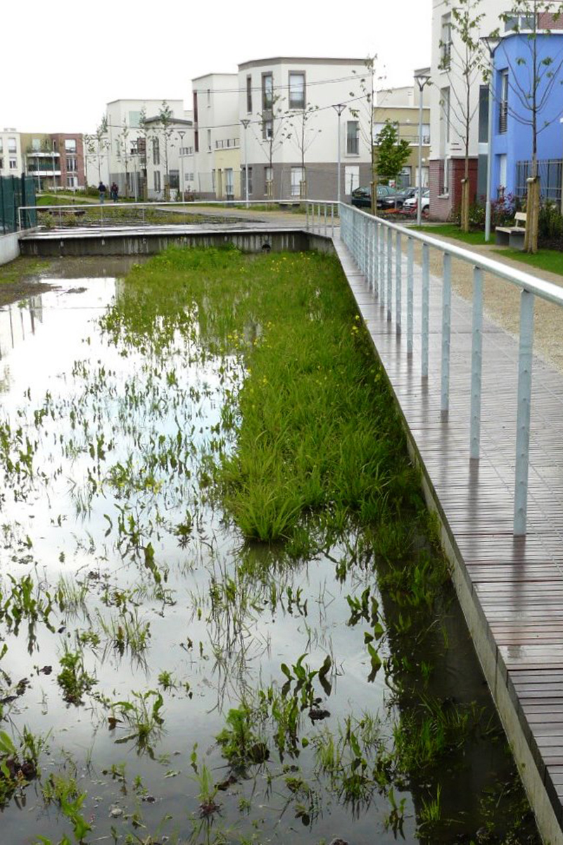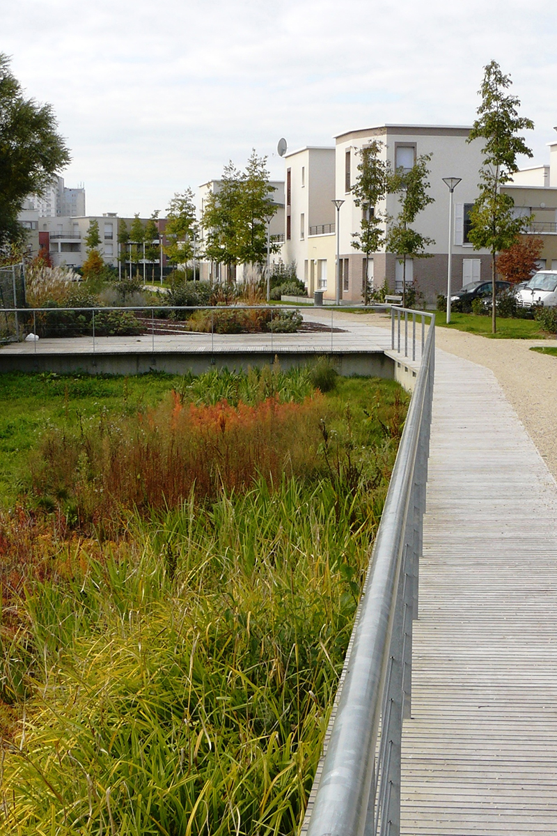 Au fil d'une longue promenade piétonne de plus de 700m, ces espaces inondables sont conçus comme autant d'espaces de proximité de nature différente, dédiés aux habitants actuels et futurs, qui évoluent différemment au gré des pluies.