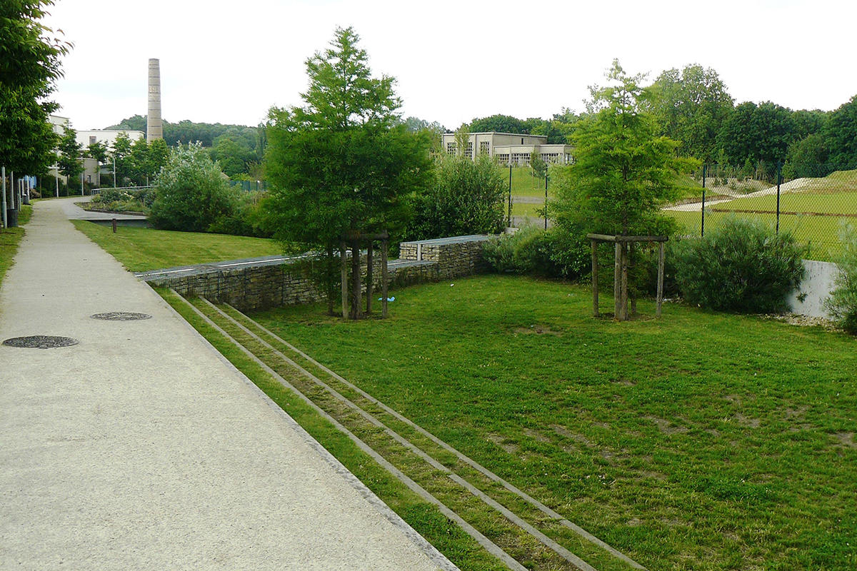 Les capacités de rétention du site ont été repensées à l'échelle d'un projet global de coulée verte et de placettes urbaines à l'interface entre le parc et le tissu résidentiel.