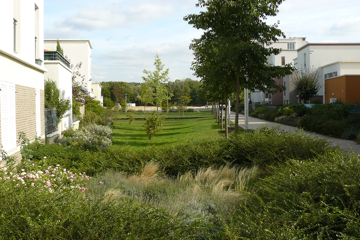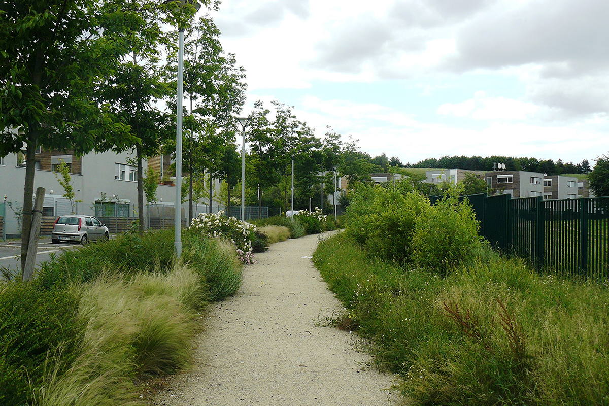 La commande initiale consistait à aménager une liaison piétonne le long de noues d'infiltration des eaux pluviales récoltées sur des futurs quartiers d'habitation (ZAC en cours) à proximité immédiate du Parc Départemental de la Courneuve.